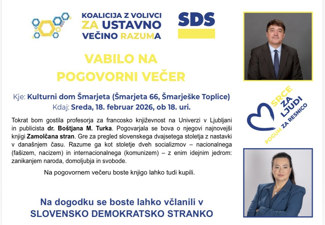 V Kulturnem domu Šmarjeta se bo drevi, ob 18. uri, začel pogovorni večer poslanke Anje Bah Žibert, gostila bo profesorja in publicista dr. Boštjana M. Turka.