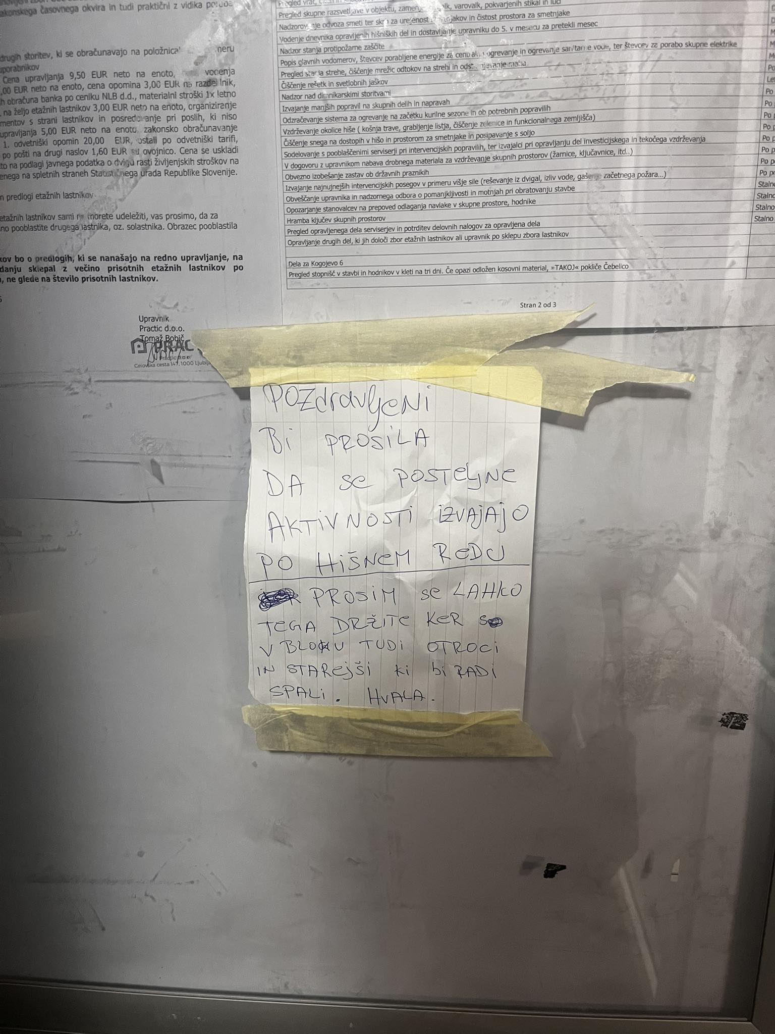 Stanovalce je prosila še, naj njeno prošnjo upoštevajo, saj da so v bloku tudi otroci in starejši, ki bi radi spali.