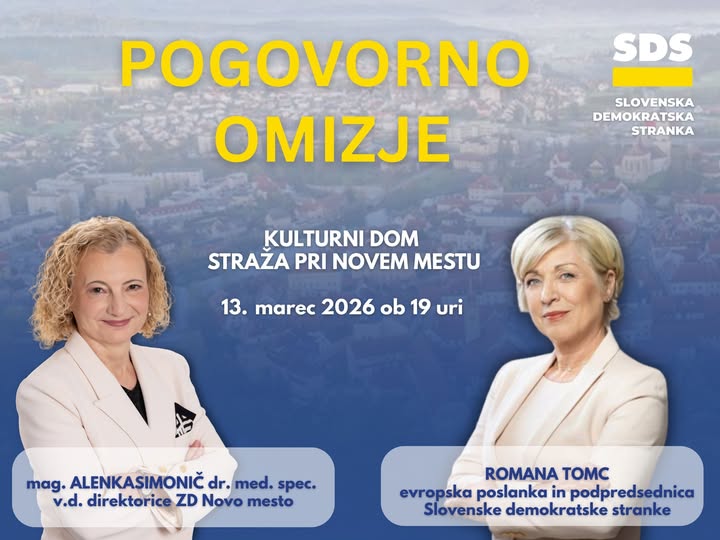 V Kulturnem domu v Straži pri Novem mestu bo drevi potekalo pogovorno omizje s kandidatko SDS za volitve v državni zbor, mag. Alenko Simonič, dr. med., in evropsko poslanko Romano Tomc.