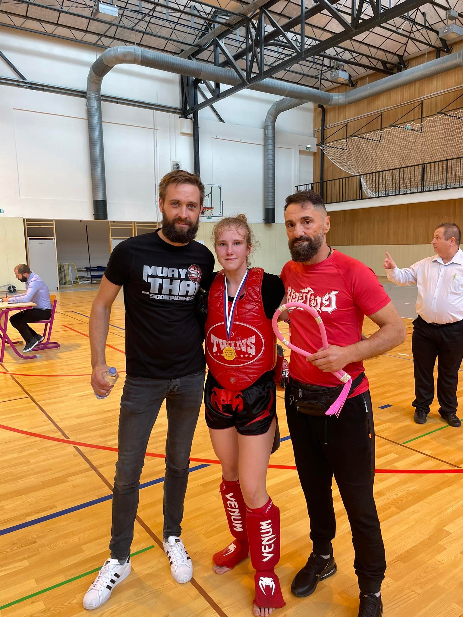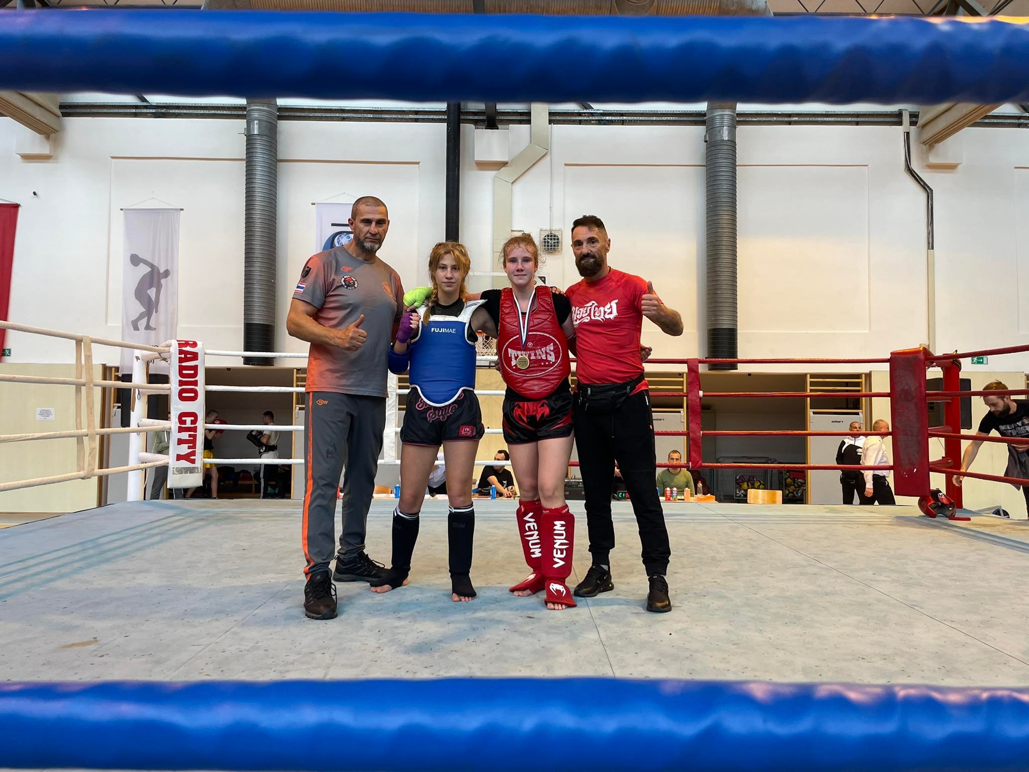 Prvo zlato medaljo za Slovenijo in Scorpion gym, je na Mednarodni ligi priborila najmlajša slovenska borka Lily Fideršek v kategoriji do 57 kg. Nasproti ji je v modrem kotu stala madžarska bojevnica Hana Bekesi. Lily je nastopila odločno in v ringu pokazala, da lahko zmagaš tudi trofejnejšo nasprotnico. Sodniki so po 3 rundah soglasno s 3:0 prisodili zmago Lily Fideršek.