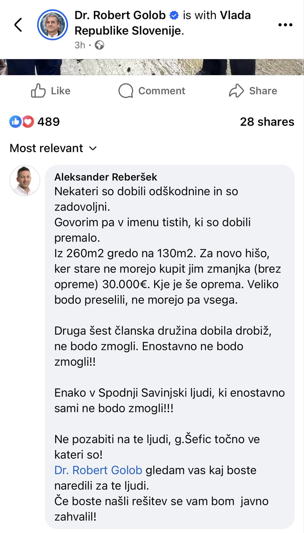 Slednje je na svoji koži občutil tudi poslanec NSi Aleksander Reberšek. Pod eno od Golobovih objav, ki jo je ta povezal tudi z uradnim profilom vlade, je Reberšek komentiral delo vlade ob sanaciji po poplavah, ob tem pa zapisal, da ni vse tako, kot kot je videti v nekaj videih, ki jih je na to temo posnel Golob. Že kmalu zatem je Golob njegovo objavo brez pojasnila izbrisal, Reberška pa blokiral, tako da na Golobovem Facebook profilu ne more komentirati ničesar več.