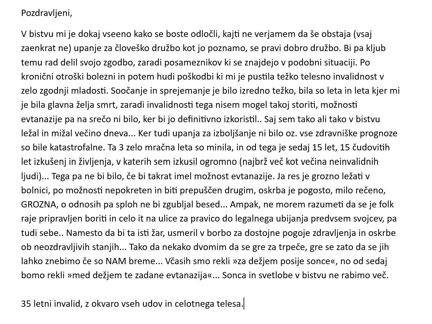 V nedeljo bomo na referendumu odločali o tem, ali bo začel veljati zakon, ki dovoljuje samomor s pomočjo, ali pa ta možnost ne bo dana. Pred tem smo prejeli zanimivo razmišljanje 35-letnega invalida, ki ima hudo okvaro vseh udov in celotnega telesa. Velja prebrati v razmislek.