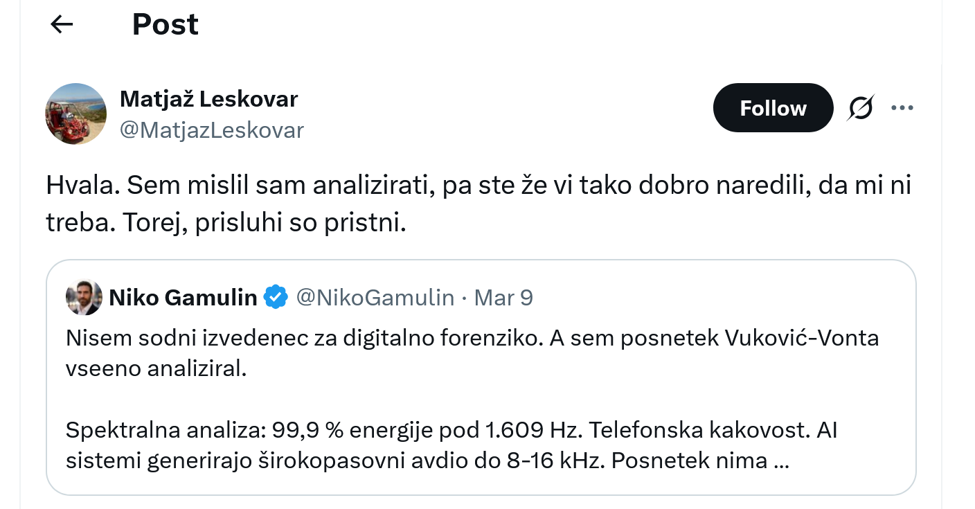 Včeraj se je med drugim oglasil višji znanstveni raziskovalec Instituta Jožef Stefan Matjaž Leskovar, ki je pregledal analizo posnetkov, ki jo je naredil strokovnjak za umetno inteligenco Niko Gamulin. Nato je Leskovar na družbenem omrežju X zapisal: “Sem mislil sam analizirati, pa ste že vi tako dobro naredili, da mi ni treba. Torej, prisluhi so pristni,” je sporočil Gamulinu. S tem je potrdil pravilnost analize in neposredno pristnost posnetkov.