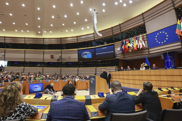 Ukrajinski predsednik Volodimir Zelenski je danes v Evropskem parlamentu nagovoril poslance in poslanke. Govor je označen kot zgodovinski, sporočila so, da je Zelenski aktiviral odnos do širitve EU, EU pa ga je prepoznala kot voditelja in stratega, ki odstopa.