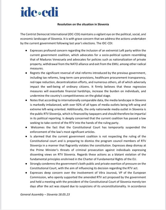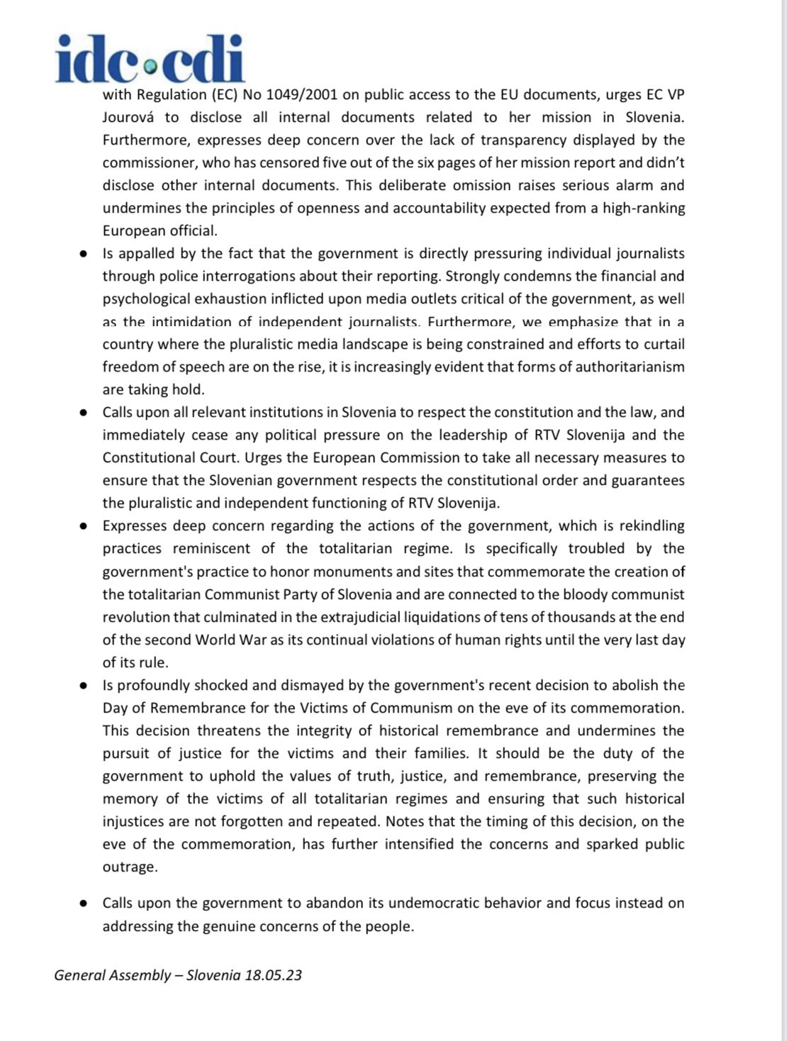 IDC-CDI vse ustrezne institucije v Sloveniji poziva, naj spoštujejo Ustavo in zakone ter nemudoma prenehajo s političnim pritiskom na vodstvo RTV Slovenije in na Ustavno sodišče. Poleg tega IDC-CDI izraža izredno zaskrbljenost glede dejanj vlade, ki obujajo prakse, ki spominjajo na totalitarni režim. Kot piše v sprejeti resoluciji, so člani generalne skupščine IDC-CDI globoko pretreseni in zgroženi nad nedavno odločitvijo Vlade, ki je na predvečer obeležitve Dneva spomina na žrtve komunizma, ta dan ukinila. Ta odločitev ogroža integriteto zgodovinskega spomina in spodkopava prizadevanja za pravičnost, tako za žrtve kot njihove družine.
