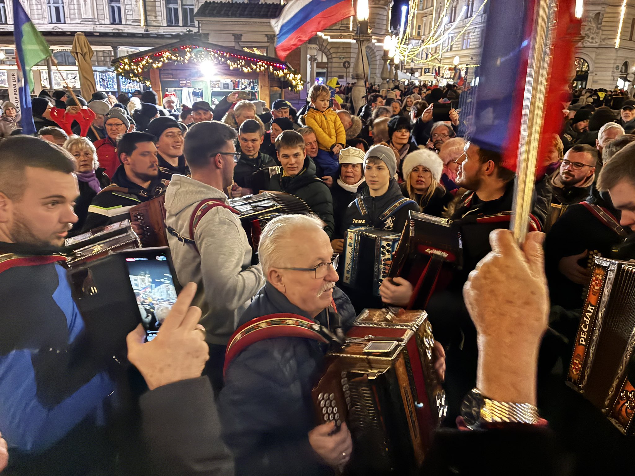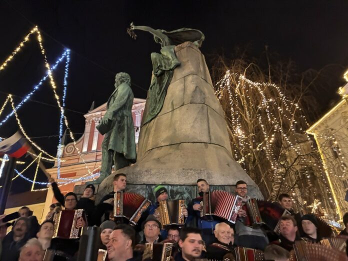 Na Prešernovem trgu v Ljubljani se je sinoči ob Dnevu samostojnosti in enotnosti zbralo več kot sto harmonikarjev iz vse Slovenije, odzvali so se pozivu k srečanju v podporo slovenski glasbi. Prišli so tudi iz Dolenjske, v podporo slovenski glasbi je skladbo Pod to goro zeleno zaigral tudi Matija Slak, brat Lojzeta Slaka. Neverjetno veliko je bilo mladih, med njimi tudi Nejc z domačije Barbo na Malem Kalu pri Mirni Peči, kjer je odraščal Lojze Slak. Nejc pa zdaj predstavlja že peti rod Barbovih muzikantov.