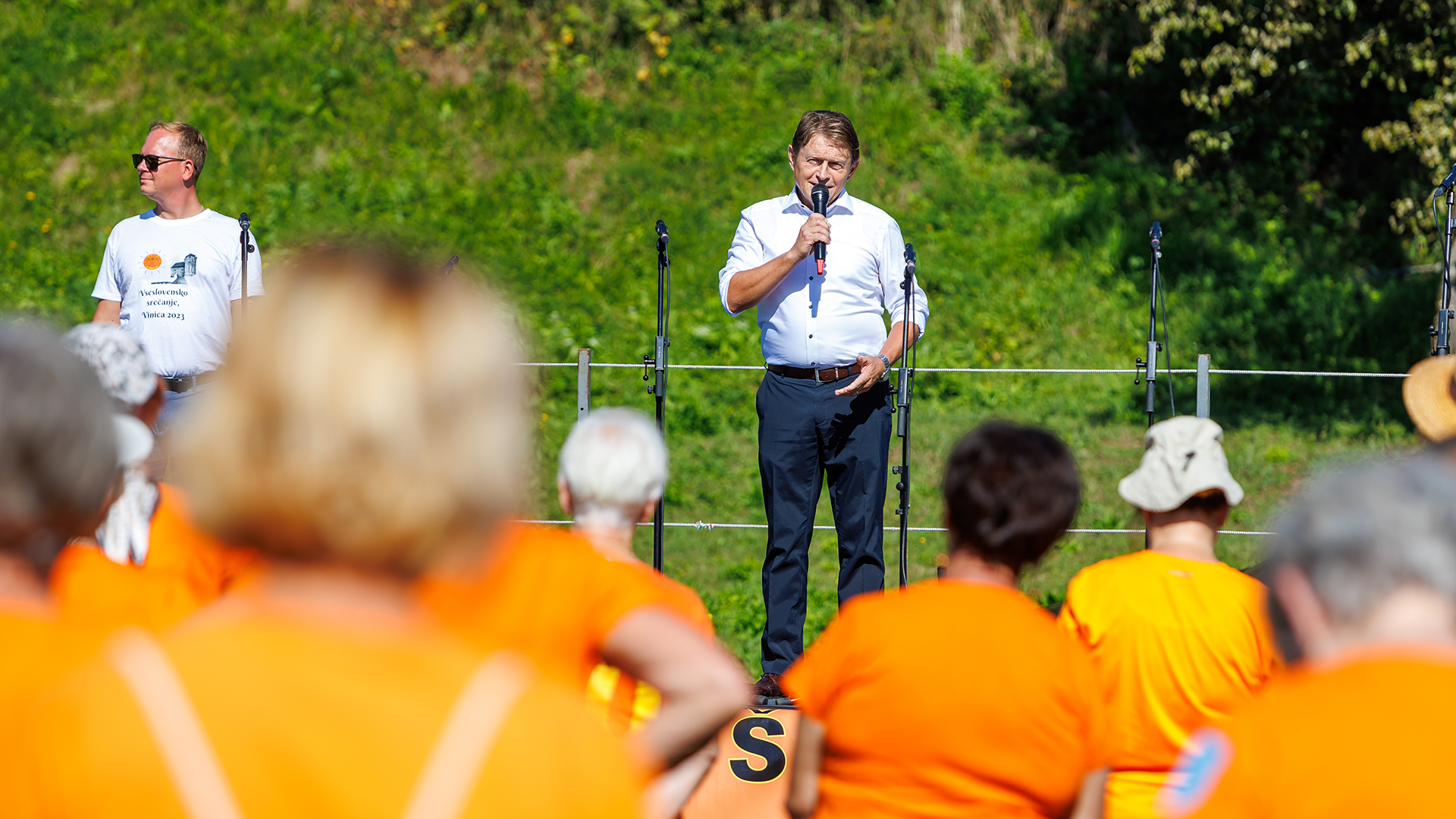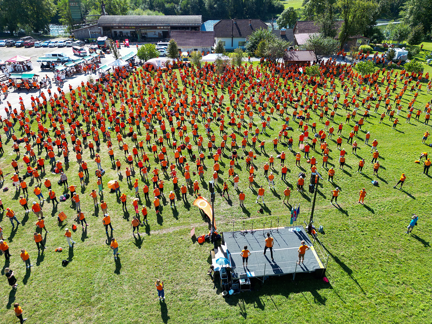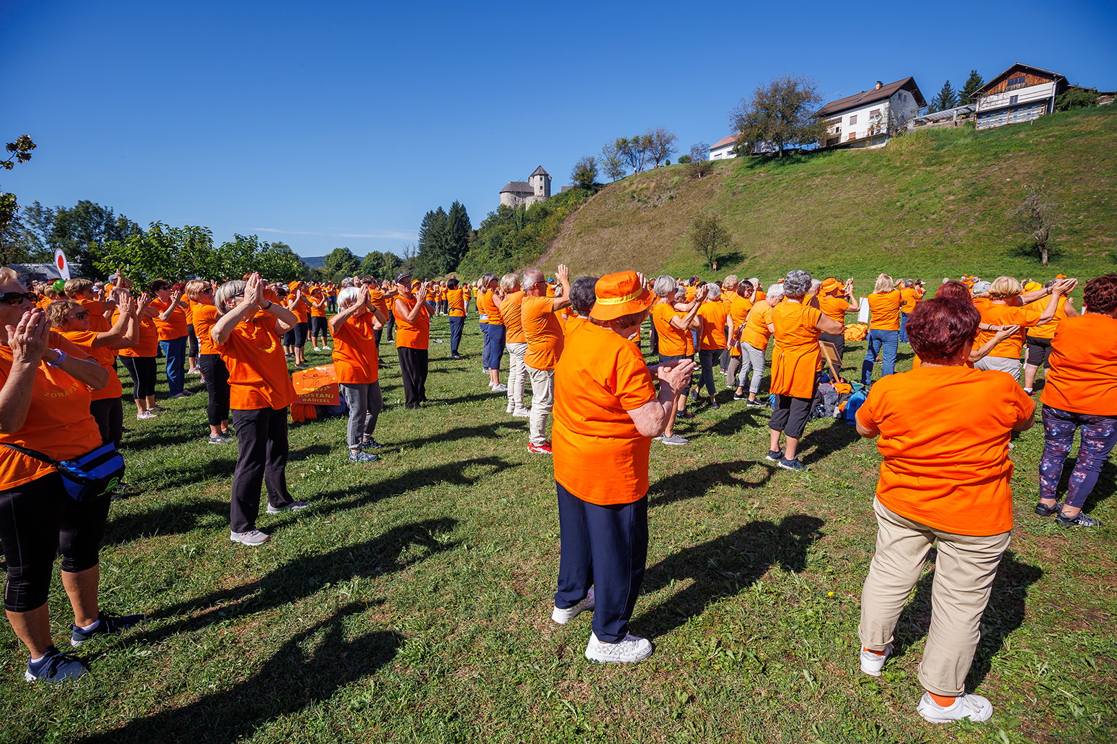 Sledila je jutranja vadba na travniku pod Gradom Vinica, vaje pa so vodili strokovni sodelavci društva: Andraž Purger, prof. športne vzgoje, Eva Jeza mag. kineziologije in Simon Jurmić, mladi kineziolog s štajerskega konca, ki je obenem napovedoval vaje in jih začinil z duhovitimi komentarji. Zanimivo je bilo slišati njegov komentar kot predstavnika mlade generacije kako je doživel to srečanje: »Veličastno je bilo stati pred enotno množico, ki je s sinhronimi kretnjami telesa ustvarjala iluzije, ki so me popeljale od jat ptic do morja. Z ramo ob rami stati s sodelavci in pred seboj zreti v množico oranžnih sorodnikov, ki svojo radost do življenja delijo in s tem poveličujejo sleherni trenutek. Velik izziv je stopiti v velike čevlje, ki jih je za zanamce pustil dr. Grishin in z njimi korakati naprej s skupnimi močmi. Navdahnjen sem z gibčnostjo, vitalnostjo in voljo naših dedkov in babic, ki ostalim vlivajo upanje v srečno, stanovitno in krepostno starost. Kako veličastno!«