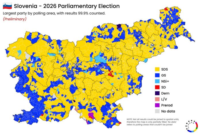 Podrobnejši zemljevid volitev v državni zbor 2026 (vir: X)