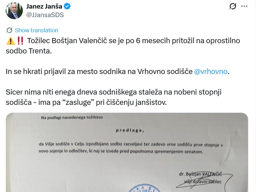 Janša je še razkril, da se je Valenčič prijavil na mesto sodnika na vrhovno sodišče, čeprav nima niti enega dneva sodniškega staleža na nobeni stopnji sodišč. Glede na to, kako stojijo zadeve na slovenskih sodiščih, se ne bi smeli čuditi, če bo Valenčič dejansko postal vrhovni sodnik, kar bi bila sicer ena največjih sramot slovenskega pravosodja.