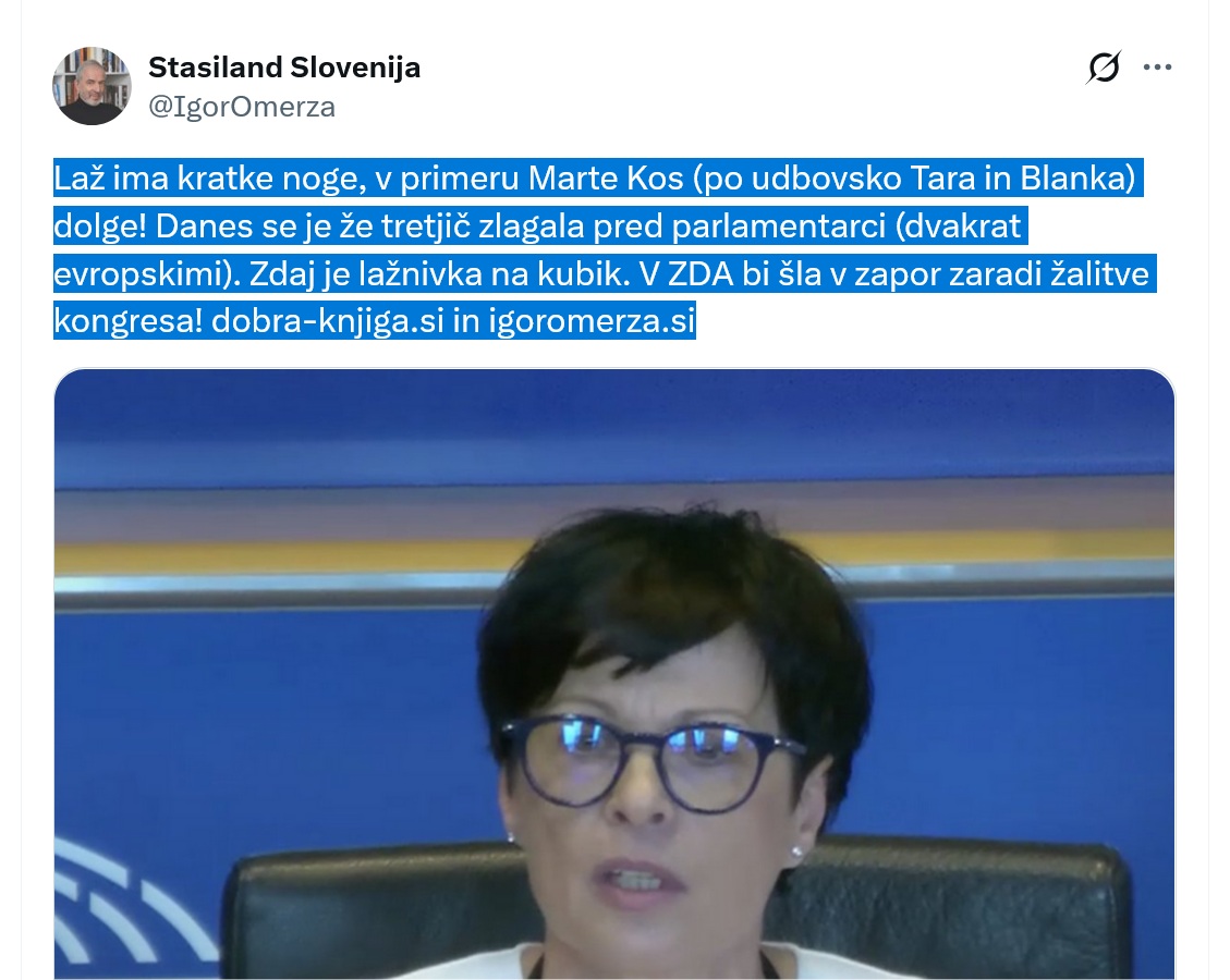 Na razpravo v Evropskem parlamentu se je oglasil tudi Omerza. “Laž ima kratke noge, v primeru Marte Kos (po udbovsko Tara in Blanka) dolge! Danes se je že tretjič zlagala pred parlamentarci (dvakrat evropskimi). Zdaj je lažnivka na kubik. V ZDA bi šla v zapor zaradi žalitve kongresa!” je zapisal na Facebooku.