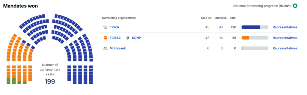Objava madžarske volilne komisije ob preštetih 98,94 % glasovnic: stranka Tisza 138 mandatov, Fidesz (Viktorja Orbana) in KDNP 55 mandatov ter stranka Mi Hazank 6 mandatov.